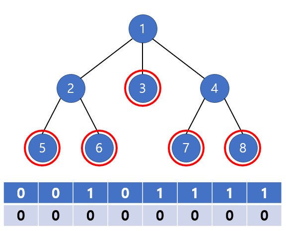 DFS로는 5, 6번 점을 확인한 후 2번 점을, 7, 8번 점을 확인한 수 4번 점을 확인하지만, 편의상 동시에 확인하면 다음과 같다. 만약 얼리 아답터라면, 자식 노드가 얼리 아답터인지와 상관없이, 이전까지의 최소 경우의 수를 더한다.