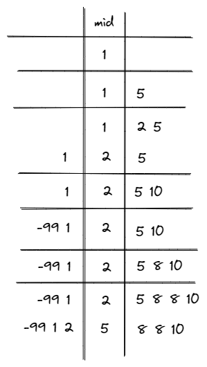 위에서 mid에 배정된 값은 중간값, 왼쪽 오른쪽 부분은 각각 중간값보다 작은 값과 큰 값들이다. 이 그림에서는 선형적으로 기록했지만, 실제로는 heap구조에 기록된다.