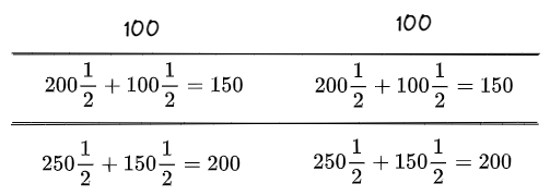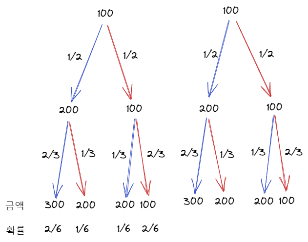 위의 두 과정을 계산하여 최종 금액과 확률은 가장 밑에서 표시한 것처럼 되고, 각 금액과 확률을 곱하여 합하면 200이 나온다.