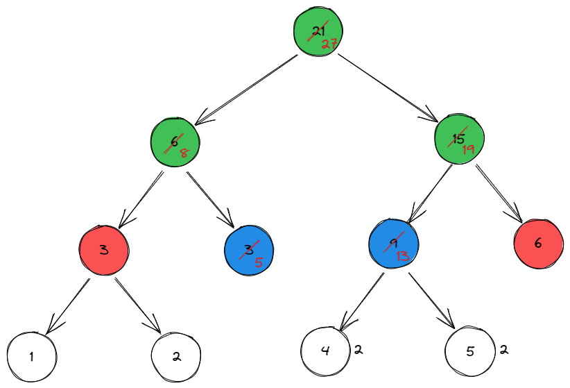 만약 파란색에 도달하면, 모든 범위가 속하게 된다. 그리고 여시거 lazy propagation의 핵심이 적용된다. 세그먼트 트리에서는 지금 탐색하는 범위에 따라 최종 속하게 되는 리프 노드의 개수를 알 수 있고, 파란색 점에서는 해당 리프 노드들을 모두 적용할 수 있도록 한다. 예를 들어 왼쪽의 파랑 점은 리프 노드이므로 2를 더하는 작업만 하여 5가 되고, 오른쪽 파랑 점은 아래의 2개의 리프 노드가 있으므로 4를 더하여 13이 된다. 추가적인 자식 노드가 있다면 자식 노드에는 2를 더하는 작업을 하는 것이 아니라 lazy 값에 2를 임시 저장하고, 필요할 때 사용한다.