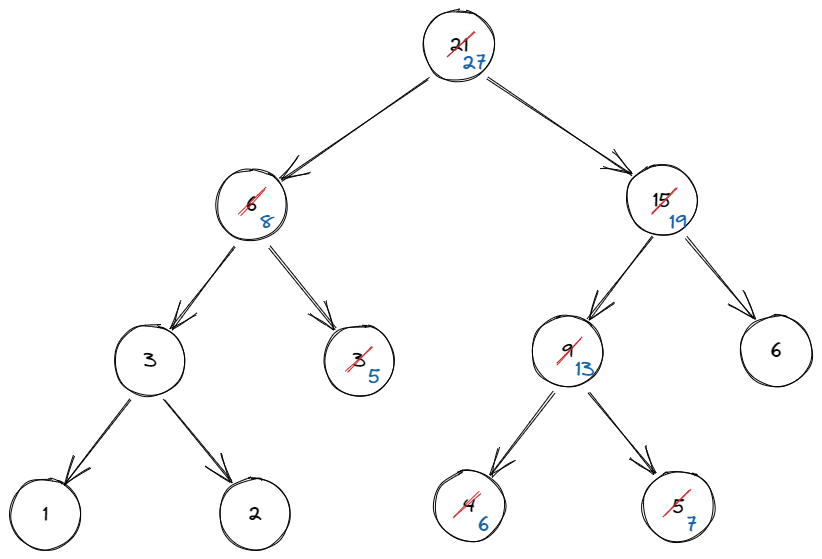 만약 파란색에 도달하면, 모든 범위가 속하게 된다. 그리고 여시거 lazy propagation의 핵심이 적용된다. 세그먼트 트리에서는 지금 탐색하는 범위에 따라 최종 속하게 되는 리프 노드의 개수를 알 수 있고, 파란색 점에서는 해당 리프 노드들을 모두 적용할 수 있도록 한다. 예를 들어 왼쪽의 파랑 점은 리프 노드이므로 2를 더하는 작업만 하여 5가 되고, 오른쪽 파랑 점은 아래의 2개의 리프 노드가 있으므로 4를 더하여 13이 된다. 추가적인 자식 노드가 있다면 자식 노드에는 2를 더하는 작업을 하는 것이 아니라 lazy 값에 2를 임시 저장하고, 필요할 때 사용한다.