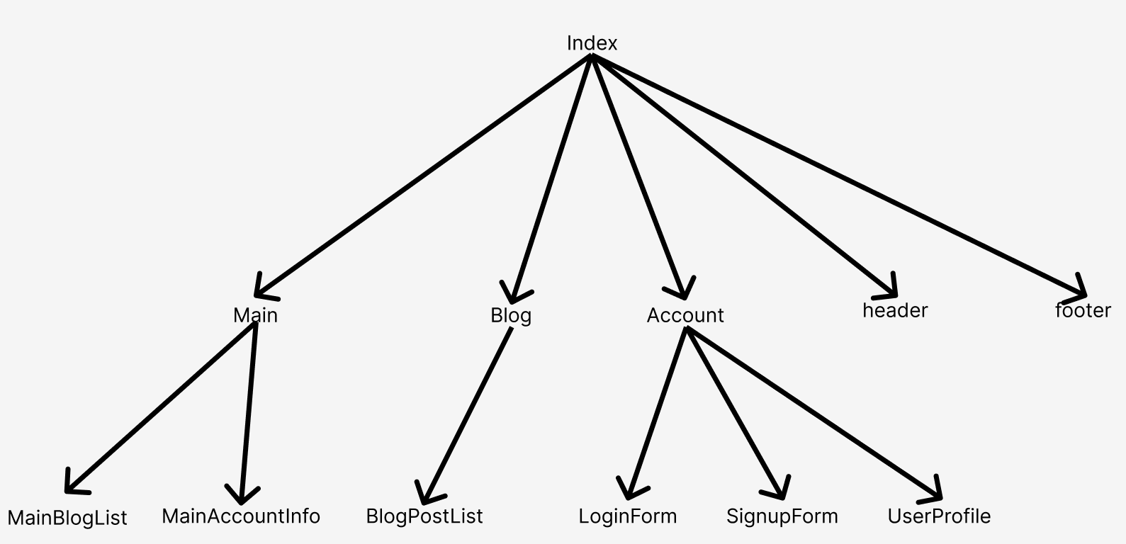 위와 같이 index에서 시작하여 라우팅은 Main, Blog, Accout컴포넌트로 하고, 공통 컴포넌트로 header, footer를 사용하는 방향으로 구성해보았다. 이를 코드에 적용하면 다음과 같이 구성된다.
