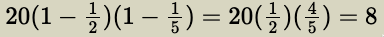 그러면 20의 약수중 소수만 발견할 수 있고, 2, 5를 찾게 된다. 그 다음으로는 오일러 피 함수를 적용해서 계산할 수 있다.